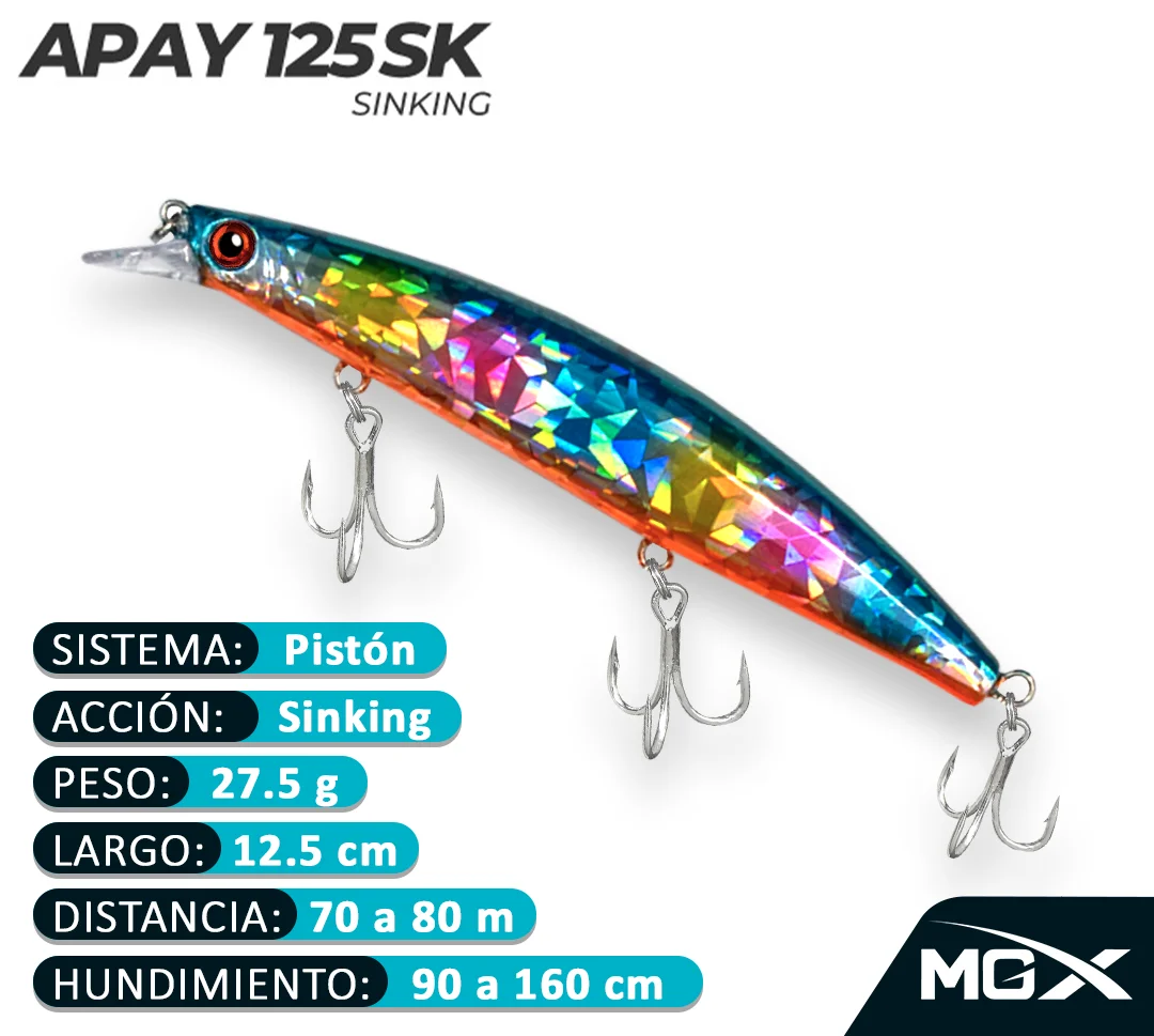 El APAY 125SK está diseñado para alcanzar largas distancias con precisión y estabilidad, gracias a su avanzado sistema de pistón. Su acción sinking permite trabajar en capas medias de agua, llegando a la zona donde se encuentran los depredadores más activos. Con un hundimiento controlado y un movimiento natural, este señuelo es ideal para quienes buscan efectividad en cada lance.